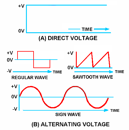 You now know that there are two types of current and voltage, that is, direct current and voltage and alternating current and voltage. If a graph is constructed showing the amplitude of a dc voltage across the terminals of a battery with respect to time, it will appear in figure 1 view A.