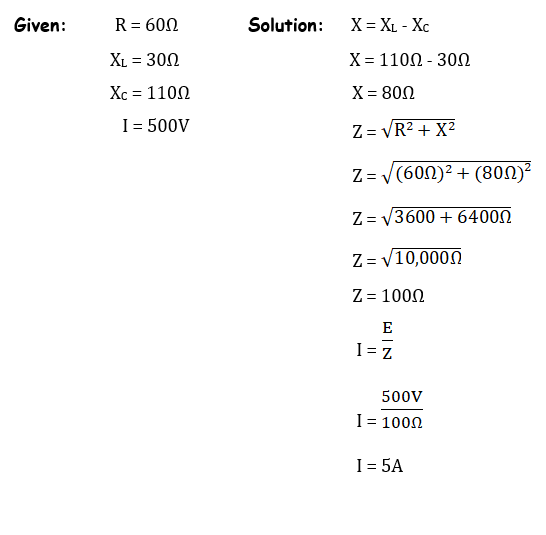 The example series RLC circuit shown in figure 66 will be used to solve for XL, XC, X, Z, IT, true power, reactive power, apparent power, and power factor. The values solved for will be rounded off to the nearest whole number.